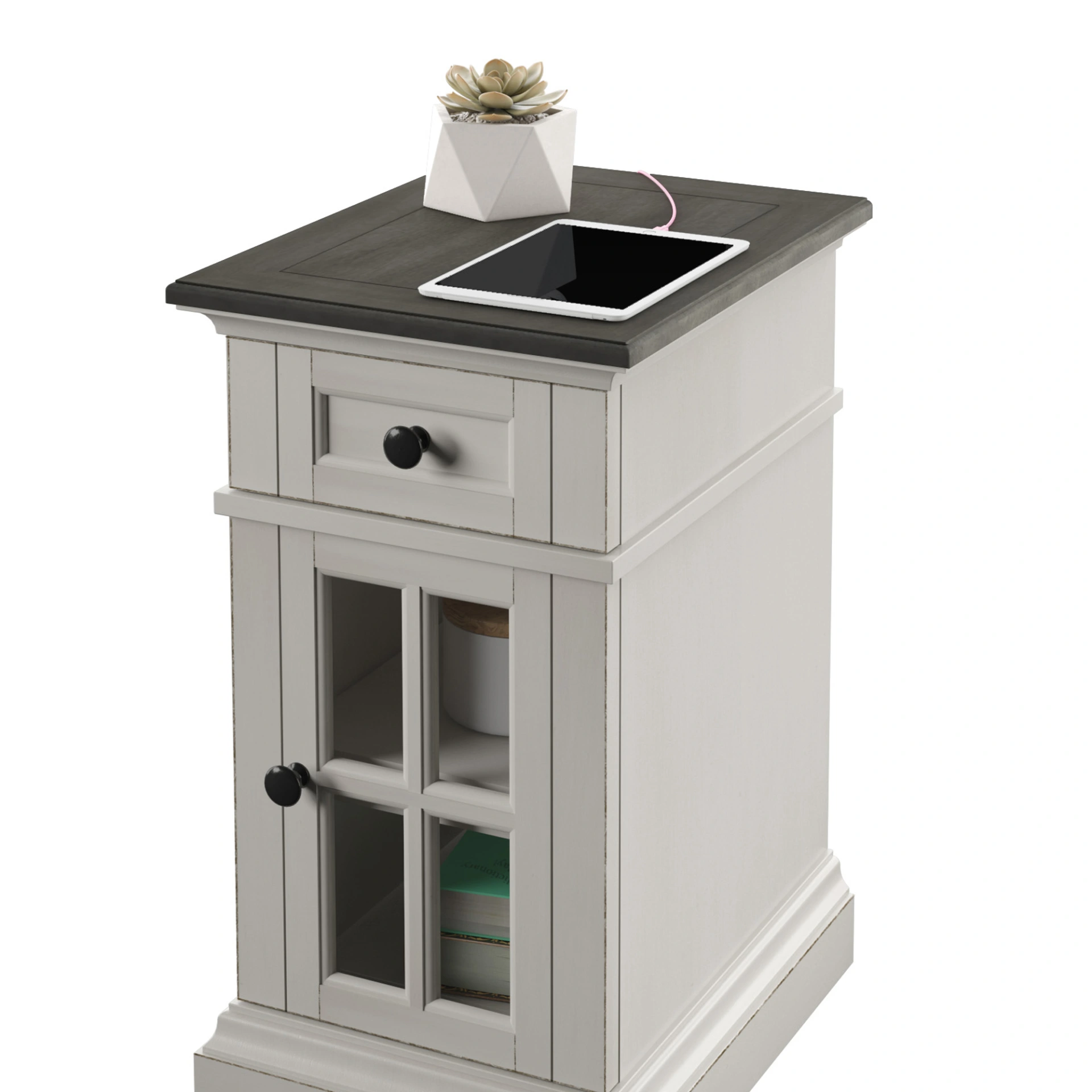 With light, casual style, the Sloane Chairside Table with Power will help pull your room together. It offers integrated power with two AC and two USB power ports to keep devices charged. With charming modern farmhouse two-tone design, it features dark pewter finish hardware and scarlett white finish body with hanford birch finish top in quality materials that are meant to last. The cabinet door has an interchangeable windowpane-style panel in wood or glass for style you choose. It can also be hung to open from the left or the right, ensuring it works perfectly on either end of your couch or loveseat. A full extension drawer with dovetail construction and the adjustable shelf within the cabinet add abundant storage that works for you and your space.
