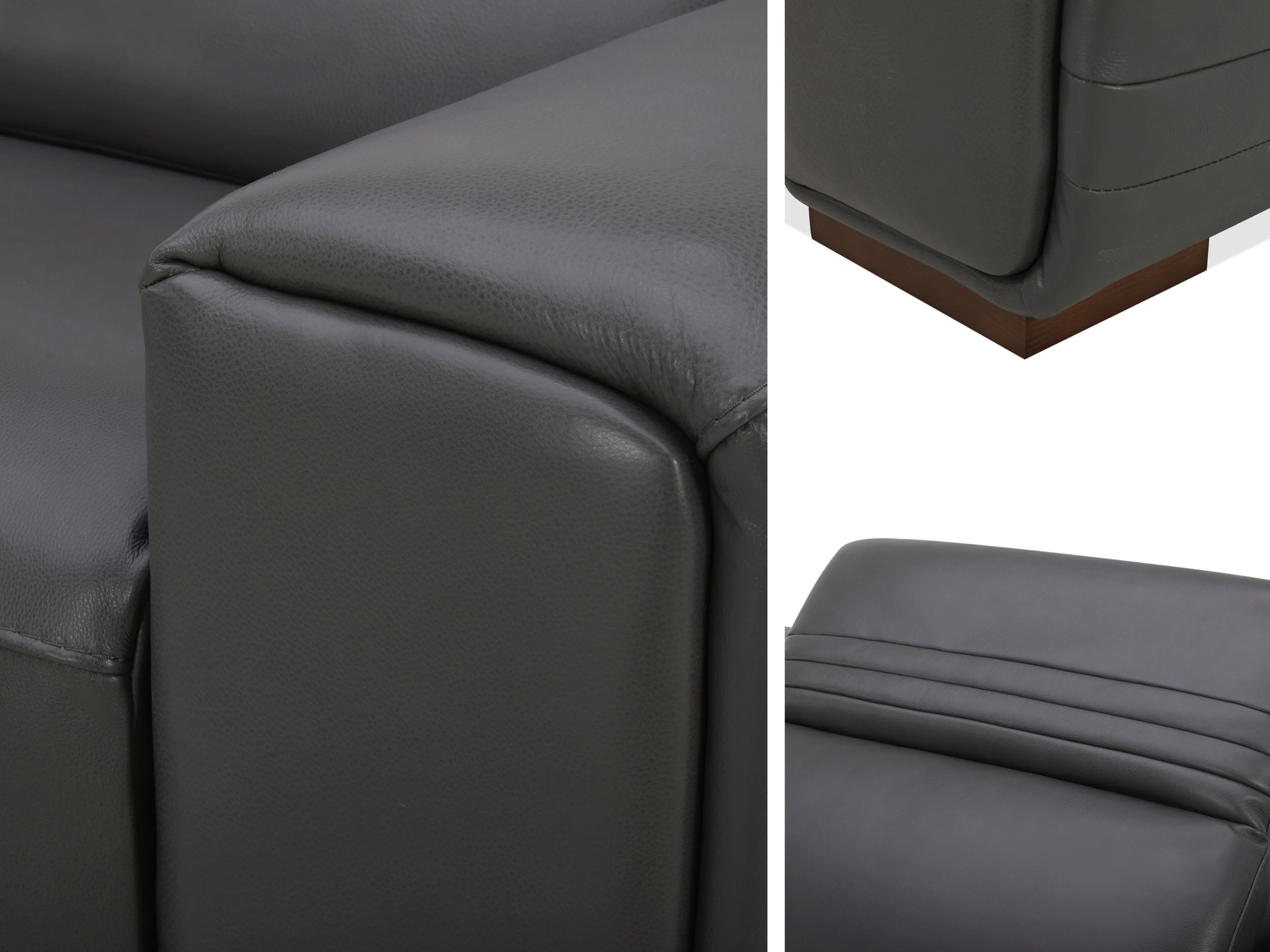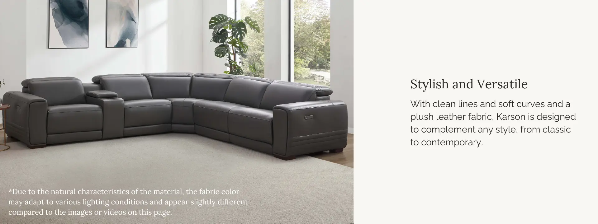 The Karson sectional features top-grain leather on all seating surfaces with vinyl match on the sides and back, offering a rich seating texture and exceptional durability for daily comfort and long-term appeal.
