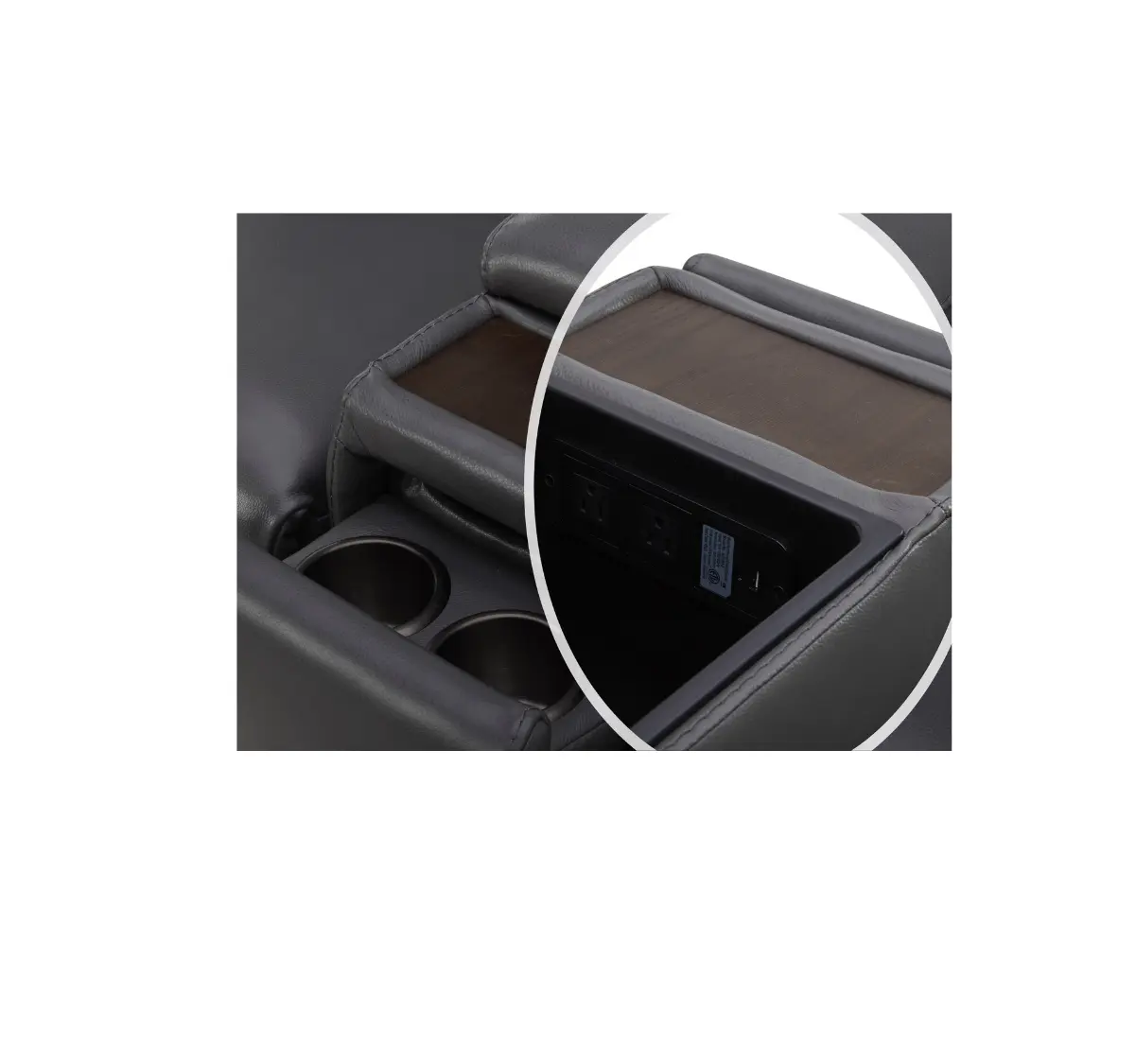 Includes a storage console with hidden cup holders and a wood tray to keep your essentials organized and out of sight.