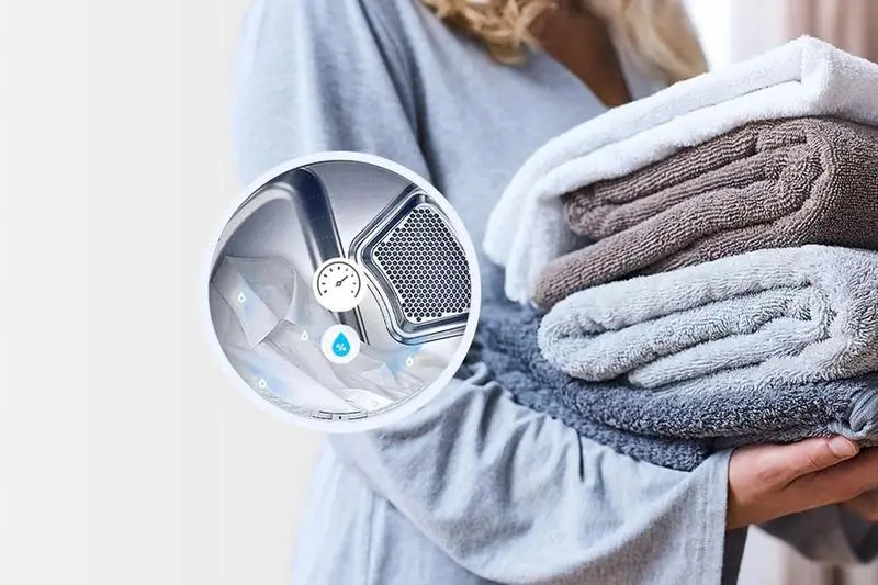 No more damp clothes—the built-in sensor detects moisture levels and automatically adjusts drying time for loads of all sizes. No more overdrying—dryer shuts off at just the right time to save energy with less wear and tear on clothes.