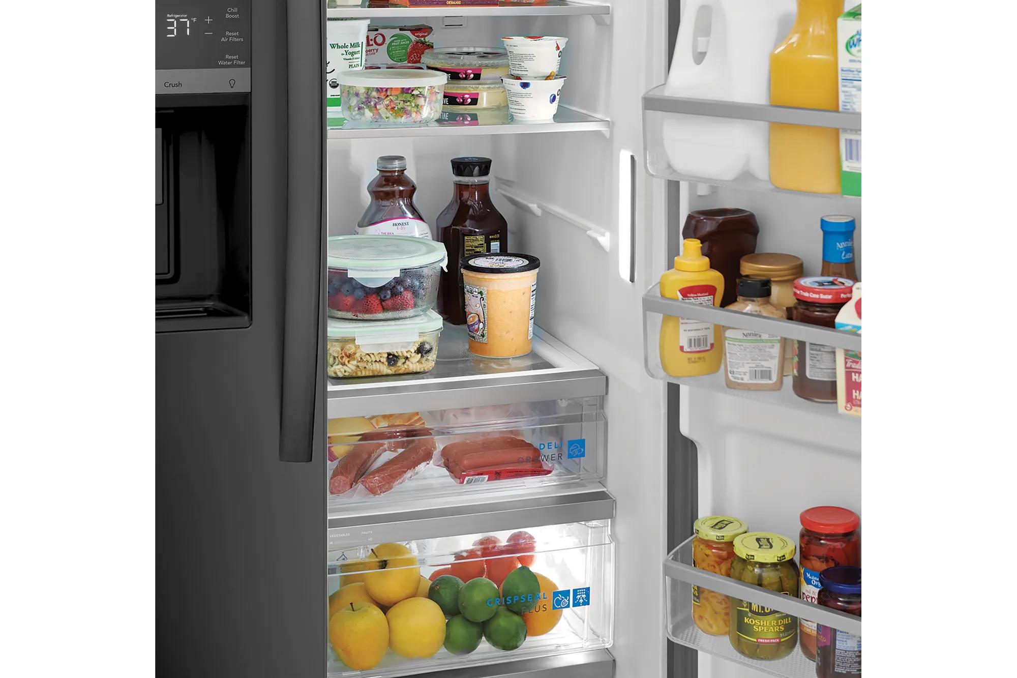 This FRIGIDAIRE GALLERY 36 in. Side-by-side refrigerator offers an advanced CrispSeal Plus Crisper. This crisper keeps produce fresh with a seal that blocks out dry air, plus an added filter reduces the gas that causes produce to ripen faster. It also features the EvenTemp Cooling System which keeps your food fresh by reacting quickly to temperature fluctuations and constantly circulates cold air throughout the fresh food and freezer compartments, ensuring a consistent cool from top to bottom.
