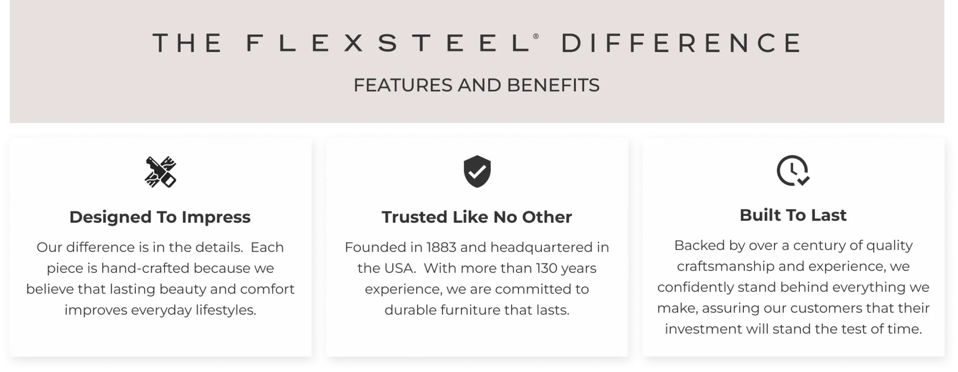 Built to last with Flexsteel’s patented Blue Steel Spring™ seat system, providing unmatched support and durability. Unlike sinuous wire springs, our springs never need retying. We believe so strongly in our spring systems, we guarantee their durability for a lifetime of use.